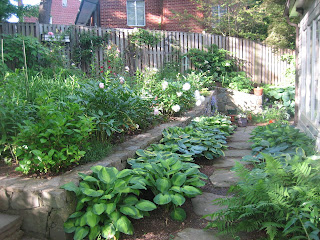 As for plants – there are a handful of shrubs, some hospital-case shrubs rescued from jobsites, some others I’ve grown from wee 3″ starts, some were transplanted from other places around the house (usually after deer munched them) — hydrangeas, witch hazel, camellias, daphne, rhodies, roses, junipers – and a ribbon of English boxwood in the very shadiest part. My crazy collections of hosta, epimedium, lilies and hellebore make this space very green, especially now, after all the rain we’ve had.