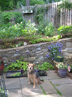 The backyard is shaped like a triangle, coming to a point about fifty feet back from the breakfast room windows, the entire garden at it’s most wide is only about sixty feet across. The back corner is so shaded by enormous oak trees, that no water or light ever reaches the ground. It’s a wasteland where potted up Christmas amaryllis spend the summer. About two-thirds of the way back from the house, three kousa dogwoods form an understory canopy under the oaks. Over to one side is a shade garden and a little sitting area under a roof extension. On the other side is a patio, surrounded by stone walls (check it out in the photo of Dylan). It is here, above the stone wall, near the patio, that I’ve located the vegetable garden – the *farm.*