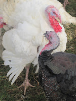 Betsy says she learned some good lessons this year with her brood of 300. Chicks arrive in the mail in June and July, staggered across a few weeks. In fact, those started in July did better than those started earlier. Better weather, more consistent warmth. The birds are raised to a particular weight, not for particular number of days, aiming for 10-14 lbs. Evidently, with smaller families, the days of the 25# turkey are over. I say, good riddance to dried out turkey – roast two smaller birds instead! Betsy calls and talks to the turkeys as we walk among them. They’re definitely interested in us, chattering and preening.