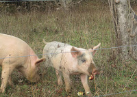 Driving through an ancient orchard along the driveway, sheep raise their heads to see who is coming. The pigs are having a fantastic time under the trees, finding windfall apples – snarfling and snuffling. I had to stop, open the windows and listen. So tame, they came to the fence, clearly looking for goodies.