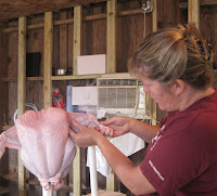 Here’s Betsy doing the final inspection – getting all the pin feathers and feather pins out.