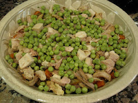 Into a pretty pie plate, layer the chicken, veggies and peas (don’t cook the peas ahead.)